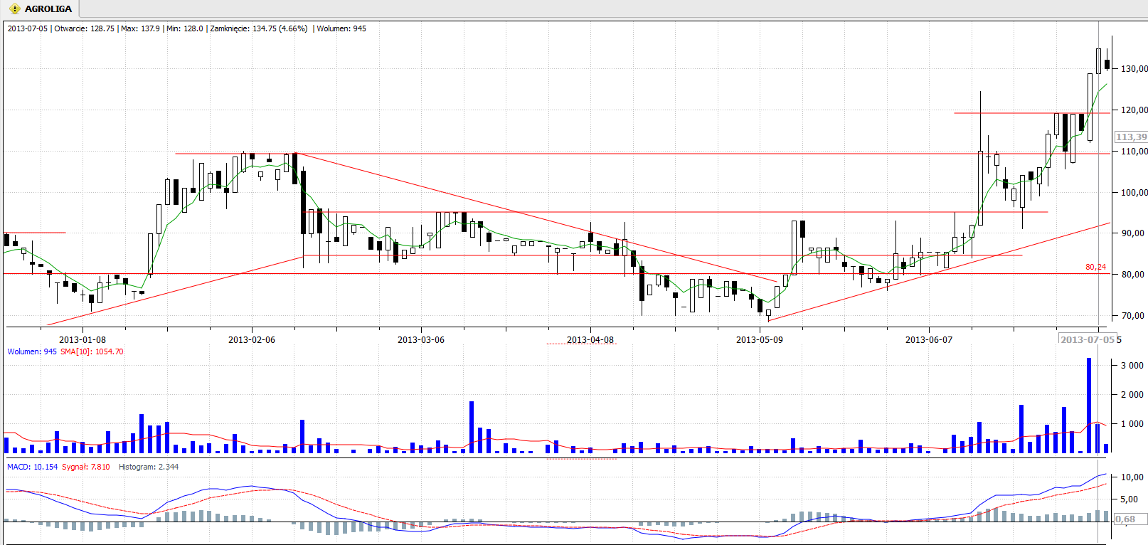11 bit studios S.A. w krótkoterminowym trendzie wzrostowym. Opór na 10,37, wsparcie na 8,63 zł. 5th Avenue Holding S.A. w krótkoterminowym trendzie spadkowym. Powróciła powyżej wsparcia na 1,62 zł. Opór na 1,95 zł. Agroliga Group Plc. wybiła się górą z konsolidacji. Opór na 138 zł, wsparcie na 125 zł. Esotiq & Henderson S.A. Spadła poniżej wsparcia na 2,06 zł. Kolejne wsparcie na 1,5 zł. EGB Investments S.A. przegrała na razie atak na opór w okolicy 2,12 - 2,15 zł, wsparcia w okolicach 1,74 zł i 1,59 zł. Hortico S.A. przetestowała dolne ograniczenie długoterminowego trendu wzrostowego i powróciła powyżej wsparcia na 4,04 zł. Opór na 4,67 zł. Internet Media Services S.A. nie pokonała oporu na 2,06 i ponownie zbliża się w kierunku wsparcia na 1,51 zł. Invista S.A. nie pokonała oporu na 60 groszach. Wsparcie w okolicy 48 - 50 groszy, wykres je właśnie testuje. Lug S.A. bardzo łagodnie rośnie, dobija do 3,50 zł. Mera S.A. po odbiciu od oporu na 2,78 zł, przebiła wsparcie na 2,20 zł, zmierza do kolejnego - na 2 zł. Pharmena S.A. delikatnie osuwa się na południe, testuje wsparcie na 8 zł, kolejne jest na 7,50 zł. PGS Software S.A. w długoterminowym trendzie wzrostowym. Ostatni spadek spowodował jednak spadek poniżej wsparcia na 3,45 zł. Kolejne wsparcie na 3,13 zł. Plasma System S.A. po odbiciu od dołka na 11,40 zł powoli zmierza na północ, wyraźny opór na 14 zł, potem na 15 zł. Scanmed Multimedis S.A. w średnioterminowym trendzie wzrostowym. Opór na 5,21 zł, wsparcie na 4,34 zł. Selvita S.A. przetestowała dolne ograniczenie trendu spadkowego. Opór na 2,57 zł, wsparcie na 2,06 zł. Synektik S.A. w konsolidacji. Opór na 13,70 zł, wsparcie na 12,04 zł. Tele-Polska Holding S.A. powoli słabnie, opór na 2,79 zł, wsparcia na 2,19 zł i 2,02 zł. Uboat - Line S.A. powróciła do trendu wzrostowego. Opór na 5,76 zł, wsparcie na 4,63 zł. ZWG S.A. w krótkoterminowym trendzie spadkowym, pokonuje kolejne wsparcia. Najbliższe na 4,82 zł.