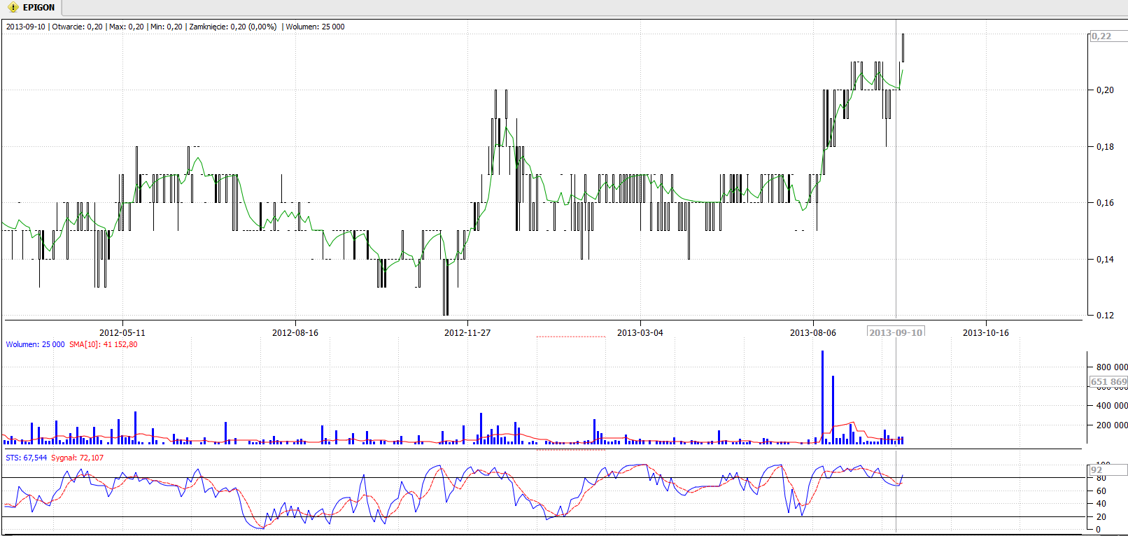 Dość nieoczekiwanie na podium obrotów pojawiła się spółka Epigon S.A. Jej akcji wymieniono za 275 tys. zł, a ich cena wzrosła przy tym o ponad 18 proc. Ostatni kurs to 26 groszy.