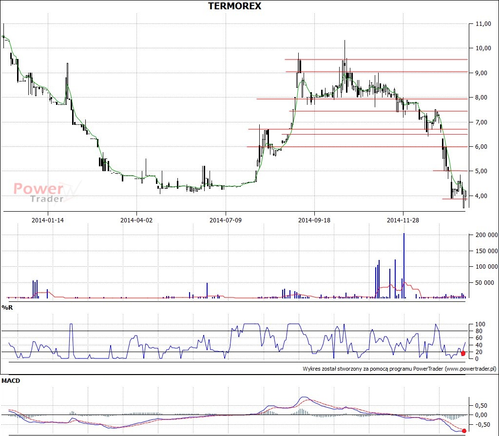 Kurs akcji Termorexu utrzymywał się na wysokich poziomach w zasadzie prawie do końca roku 2014. Owszem, notowania osuwały się stopniowo na południe (dość powiedzieć, że szczyt z października to 10,32 zł, zaś w grudniu cena schodziła nawet poniżej 7 zł), ale trend był spokojny. Dopiero w styczniu doszło do gwałtownej przeceny, której finałem było testowanie wsparcia na 3,90 zł, a nawet (23 stycznia) dołka na 3,50 zł, jakkolwiek sesja z tego dnia finalnie była zwyżkowa.