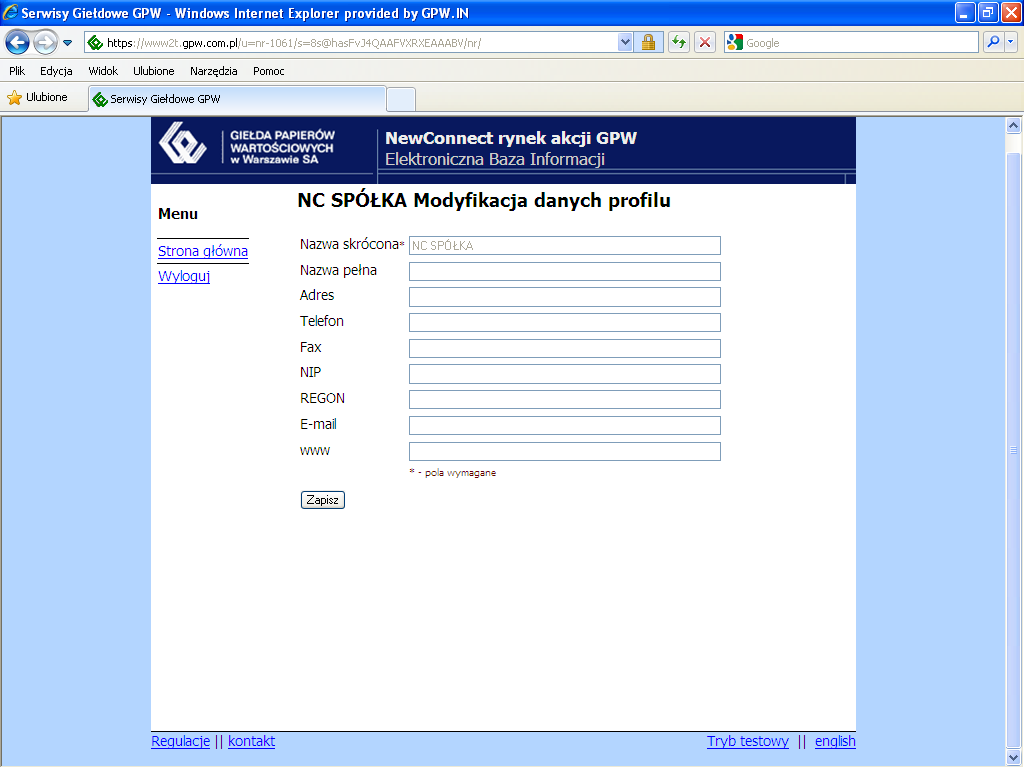 Zamieszczona w niniejszym Opisie korzystania z EBI prezentacja poszczególnych formularzy w systemie EBI została opracowana na przykładzie spółki z rynku NewConnect.
