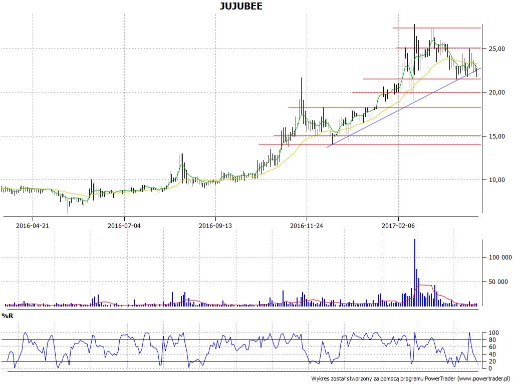 Kurs akcji biegnie pomyślnie, aczkolwiek trend wszczęty w połowie grudnia 2016 jest właśnie testowany. Wsparcia to 21,80 zł, 21,53 zł, 20 zł czy 18,30 zł, a jeszcze niżej 15 zł. Wskaźnik %R dał ostatnio sygnał pro-sprzedażowy. Poziom oporu mamy w pobliżu 27,20 - 27,30 zł, choć niżej znaczenie może mieć linia 25 zł.