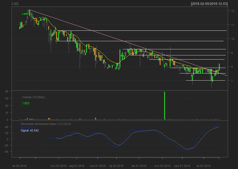 Wykres LUG był w lutym przy 12 zł - przez moment. Ten opór nie został pokonany, a notowania poszły na południe. Trend spadkowy został pokonany dopiero teraz, a wciąż nie jest to całkiem jasne i potwierdzone. Tym niemniej mamy 8,20 zł, a przecież nawet w tym miesiącu mieliśmy 6,50 zł.